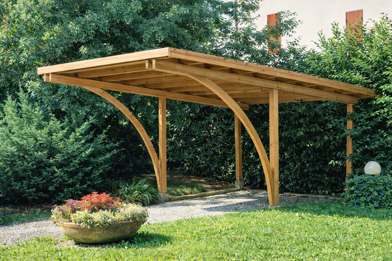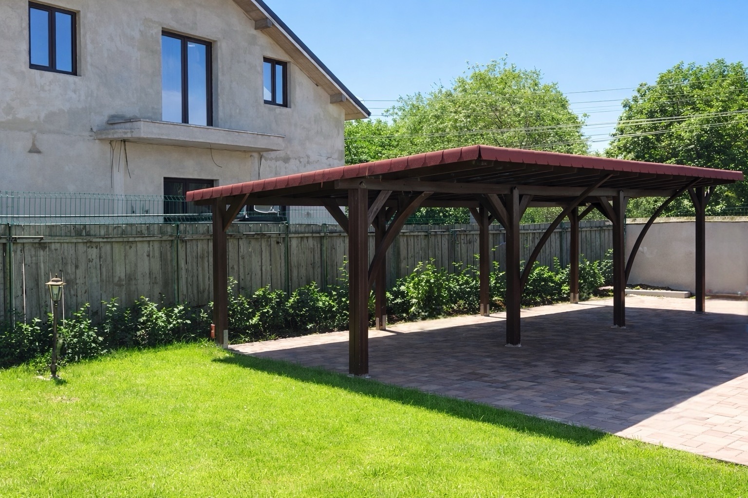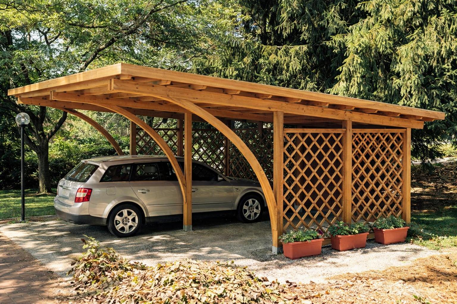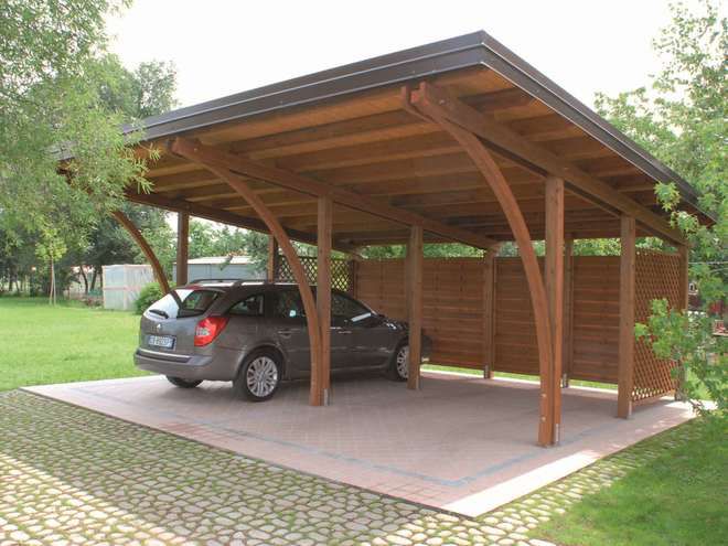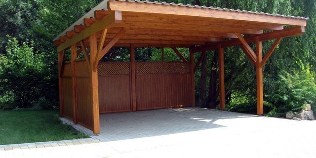 Pergole parcare realizate din lemn rasinos uscat si tratat special pentru exterior.